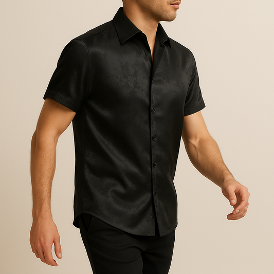 Luxury Men’s Black Satin Floral Short-Sleeve Shirt