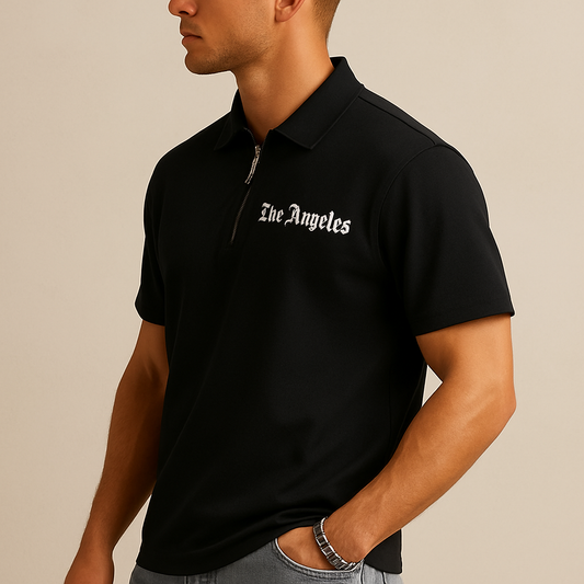 Men’s Luxe Zipper Letter-Print Polo – Los Angeles